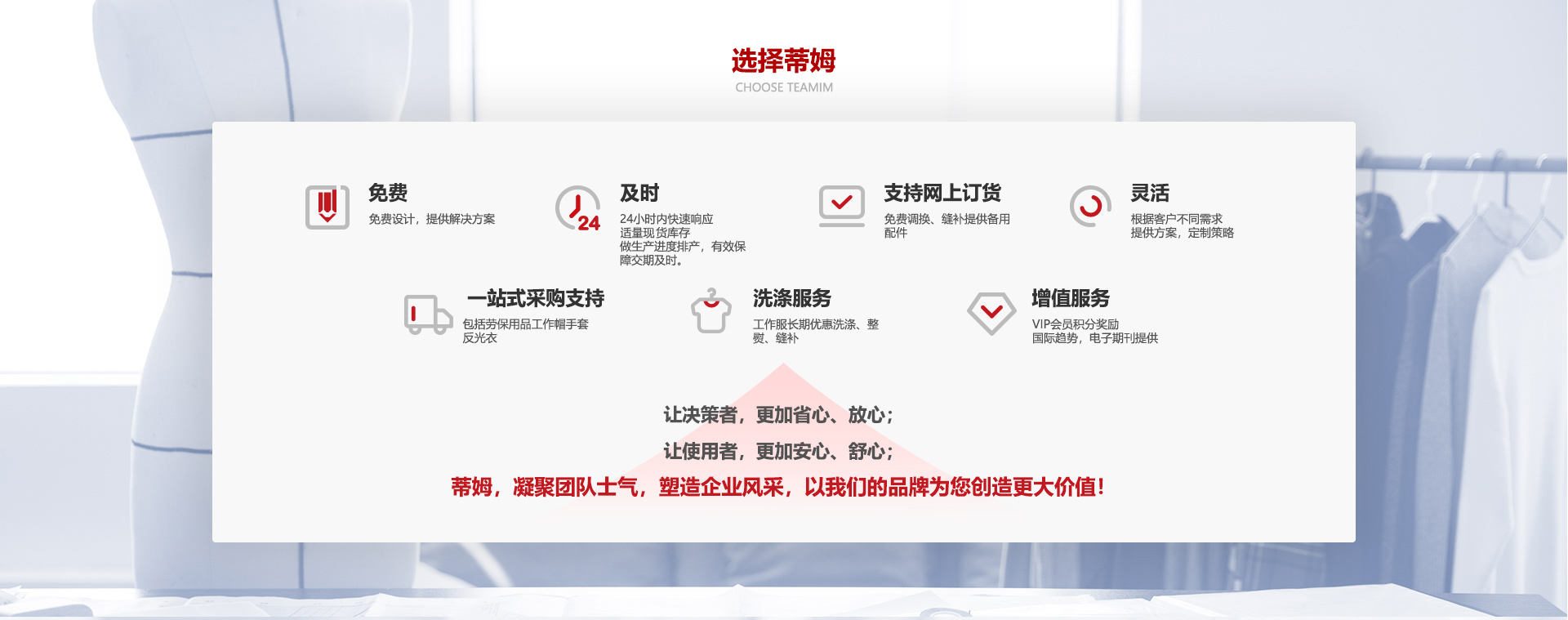 蒂姆服裝創(chuàng)立于1999年,已有20多年的歷史,集服裝服飾設(shè)計(jì)研發(fā)、生產(chǎn)制作、產(chǎn)品銷(xiāo)售+服務(wù)、技術(shù)提案、一站式采購(gòu)支持于一體的國(guó)內(nèi)為數(shù)不多的具備全價(jià)值鏈的專(zhuān)業(yè)制服供應(yīng)商。公司嚴(yán)格按照ISO9001質(zhì)量管理體系標(biāo)準(zhǔn)及五星級(jí)售后服務(wù)體系執(zhí)行,專(zhuān)注于研究職業(yè)裝材料的健康性、舒適性、時(shí)尚性、安全性、科技性。塑造企業(yè)形象,展現(xiàn)企業(yè)風(fēng)彩。